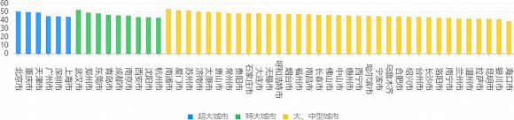 在超大城市中,北京市自由流速度最高,达50.79km/h;特大城市中,武汉市自由流速度最高;大、中型城市中,南通市自由流速度最高。