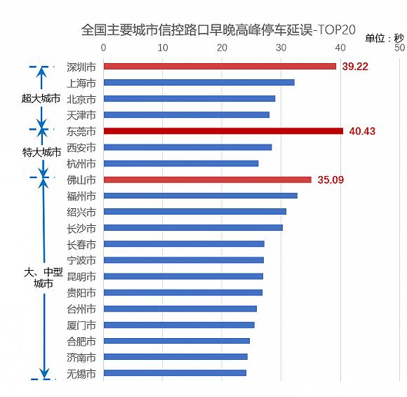 在全国所有城市中,路口延误前三位依次为东莞、深圳和佛山,其中东莞市红绿灯(信控)路口早晚高峰平均停车延误时长超过40秒/车。在超大城市中,深圳延误时间最长,超39秒/车。大中型城市中,佛山延误时间最长,超35秒/车。