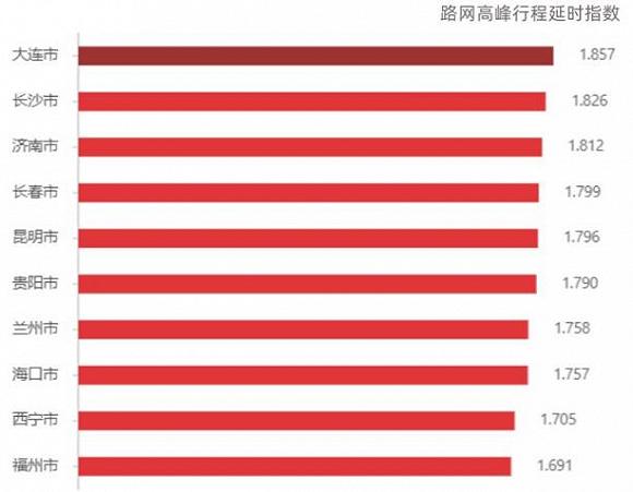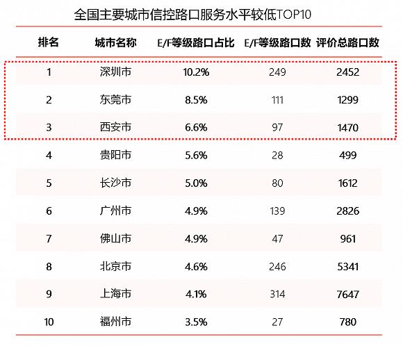 数据显示,早晚高峰时段路口服务水平较低的城市主要分布在珠江三角洲,排名前三位城市依次为深圳、东莞和西安。