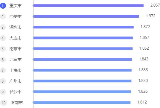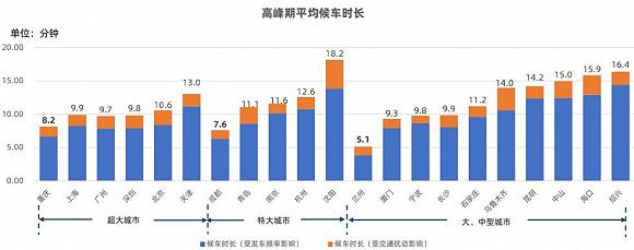在《报告》研究城市范围内,兰州的候车时长为5.1分钟,在所有城市中最优。重庆、成都分别位列超大城市、特大城市的首位。