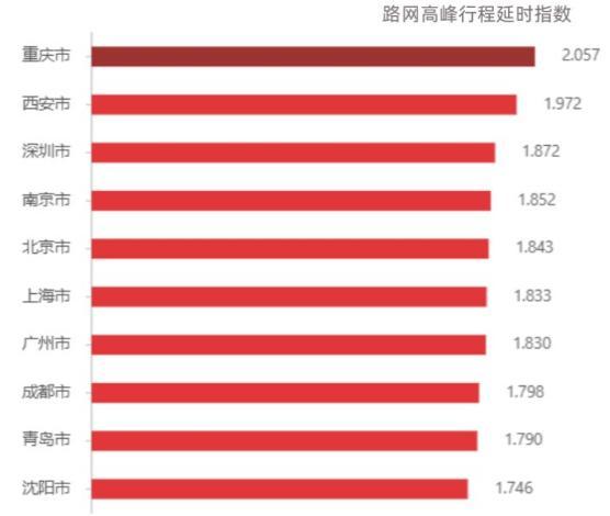 在高德地图交通大数据监测的50个城市中,2020年二季度全国高峰拥堵延时指数最高的十个城市依次为:重庆、西安、深圳、大连、南京、北京、上海、广州、长沙、济南。其中,重庆路网高峰行程延时指数2.057,平均车速仅24.22km/h。