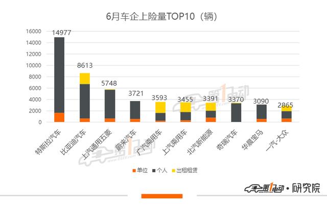 从车企角度来看,特斯拉凭借一款车型毫无悬念摘得冠军。排名第二的比亚迪共有14款车型有上险量录入,其中,比亚迪秦EV、比亚迪E2和比亚迪宋DM为主力支撑车型,分别贡献了24.0%、16.5%和12.1%的上险量。6月比亚迪的出租租赁上险共计1,859辆,占比亚迪总上险的21.6%,其中比亚迪秦EV和比亚迪E3分别上险805辆和372辆。
