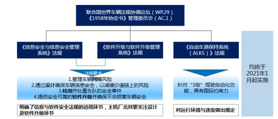 伴随汽车对软件领域投入的加大,汽车产品的软件化发展程度越来越高,相关法规也在逐步跟进。近日,联合国世界车辆法规协调论坛(WP.29组织)第181次全体会议上,表决通过了三项智能网联汽车领域重要法规,涉及信息安全、软件及三级驾驶自动化功能,将于2021年1月起实施,具体如下图所示。其中,2项均涉及软件领域。可见,汽车软件安全问题正成为世界各国共同的关注点。