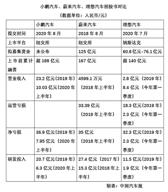 一是公开融资估值。小鹏汽车此次IPO发行价区间和发行股份数未定,融资额暂时不确定,招股书所列1亿美元仅是例行披露的占位符,不代表本次IPO实际融资额。而同属纽交所,2018年9月12日上市的蔚来汽车,拟募资额度为18亿美元(约合人民币125亿元),位居三家新势力之首。理想汽车今年7月30日登陆纳斯达克公开募集的资金为8.74亿-10.93亿美元(约合人民币60.8亿-76.1亿元)。