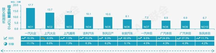 车企方面,2020年7月,狭义乘用车零售销量排名前三的企业是一汽-大众、上汽大众和上汽通用,其中一汽-大众7月销售17.7万辆,同比去年上升15.3%;上汽大众销售13.7万辆,同比下降5.5%;上汽通用销售11.7万辆,同比上升1.5%。此外,吉利汽车、长安汽车也跻身销量榜前10强,7月销量分别增长15.2%、62.8%。值得一提的是,TOP 10车企中,只有上汽大众月度销量同比出现下降。