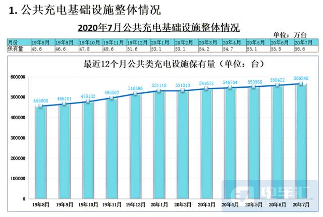 中国电动充电基础设施促进联盟数据显示,2020年7月,联盟内成员单位总计上报公共类充电桩56.6万台,其中交流充电桩32.6万台、直流充电桩24.0万台、交直流一体充电桩488台。从2019年8月到2020年7月,月均新增公共类充电桩约1.0万台。截止2020年7月,全国充电基础设施累计数量为134.1万台,7月数量同比增加27.6%。