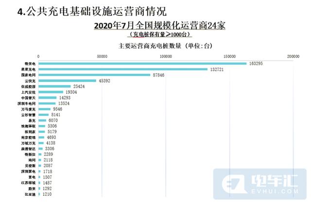 截止到2020年7月,全国充电运营企业所运营充电桩数量超过1万台的共有8家,分别为:特来电运营16.3万台、星星充电运营13.3万台、国家电网运营8.8万台、云快充运营4.5万台、依威能源运营2.5万台、上汽安悦运营1.9万台、中国普天运营1.4万台、深圳车电网运营1.4万台。这8家运营商占总量的88.6%,其余的运营商占总量的11.4%。