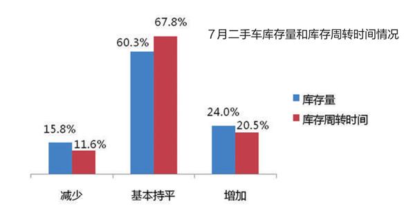 调查显示,7月库存量、库存周转时间基本持平。认为库存量和上月持平的二手车经理人占60.3%,认为增加的占24.0%,认为减少的占15.8%;认为库存周转时间持平的比例为67.8%,认为增加的比例为20.5%,认为减少的占11.6%。