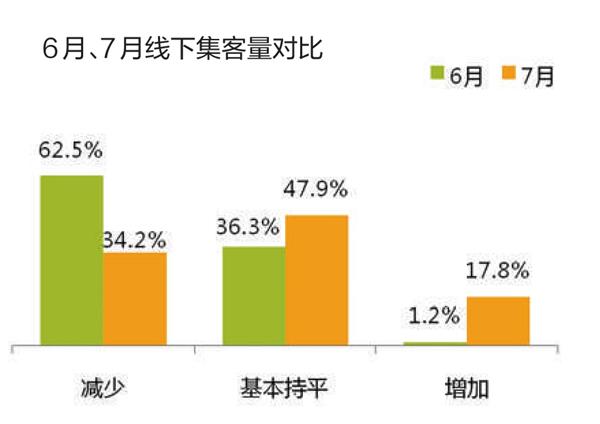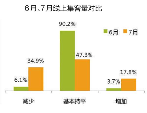调查显示,7月线上和线下集客量均有所减少。在线上集客量方面,认为减少的比例为34.9%,认为持平的占47.3%,认为增加的比例为17.8%;线下集客量方面,认为减少的比例为34.2%,认为持平的二手车经理人占47.9%,认为增加的占17.8%。