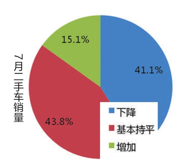 调查显示,7月二手车销量下降,认为下降的二手车经理人占41.1%,认为持平的比例为43.8%,认为增加的比例为15.1%。