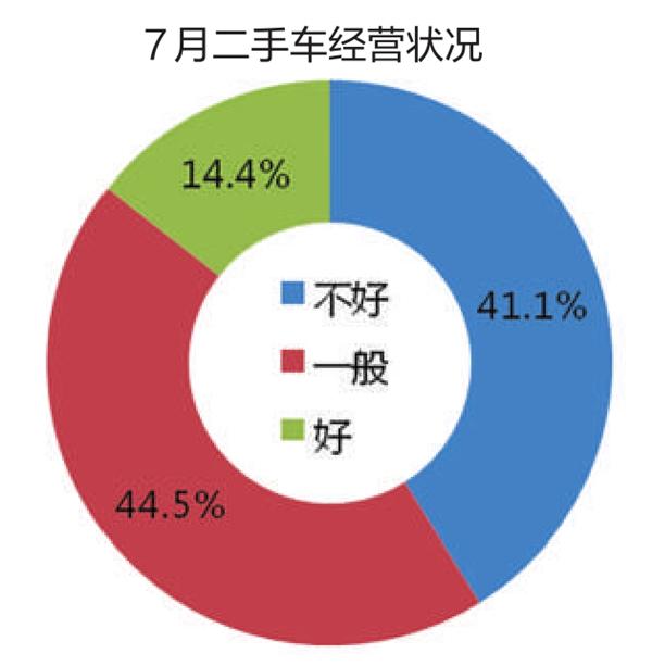 相当数量的二手车经理人认为7月的经营情况不太理想。调查显示,认为经营状况不好的二手车经理人占41.1%,认为经营状况一般的占44.5%,认为好的仅占14.4%。