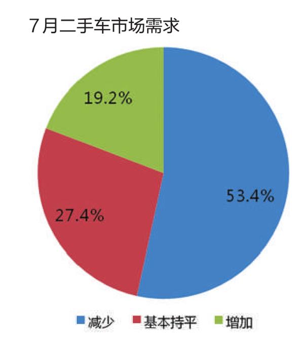 7月,二手车市场总需求在减少。调查显示,认为需求减少的二手车经理人占53.4%,认为基本持平的比例为27.4%,认为增加的占19.2%。