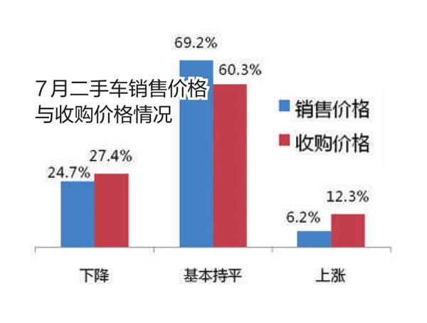 7月,二手车的销售价格与收购价格基本与上月持平。从销售价格看,认为持平的二手车经理人占比为69.2%,认为下降的占24.7%,认为上涨的仅占6.2%;在收购价格方面,认为持平的比例为60.3%,认为下降的占27.4%,认为上涨的占12.3%。