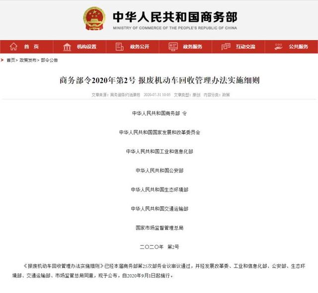 日前,从中华人民共和国商务部获悉,《报废机动车回收管理办法实施细则》已经本届商务部第25次部务会议审议通过,并经发展改革委、工业和信息化部、公安部、生态环境部、交通运输部、市场监管总局同意,现予公布,自2020年9月1日起施行。