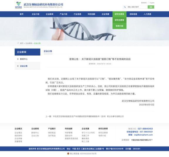 澄清公告 :关于新冠灭活疫苗“接受订购”等不实传闻的回应