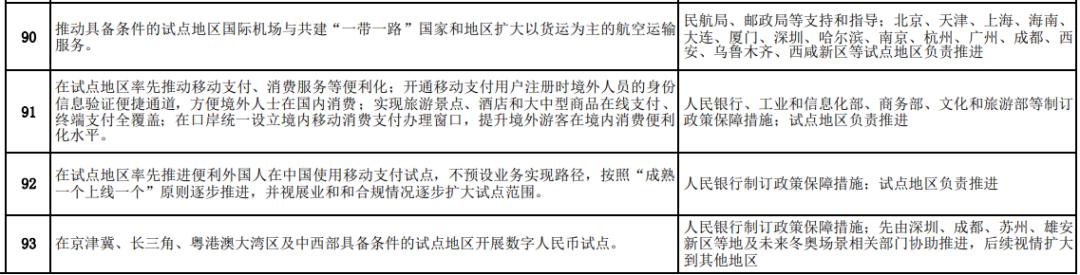 《全面深化服务贸易创新发展试点总体方案》在“全面深化服务贸易创新发展试点任务、具体举措及责任分工”部分提出:在京津冀、长三角、粤港澳大湾区及中西部具备条件的试点地区开展数字人民币试点。人民银行制订政策保障措施;先由深圳、成都、苏州、雄安新区等地及未来冬奥场景相关部门协助推进,后续视情扩大到其他地区。