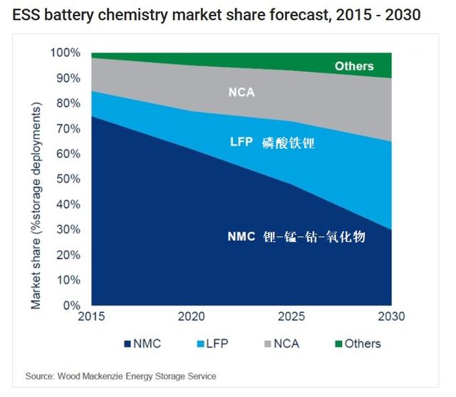 伍德麦肯兹的报告称,2015年磷酸铁锂在电能储存化学品市场的份额为10%,在随后的五年中,这种电池的市场份额迅速上升,预计到2030年时市场份额将超过30%。