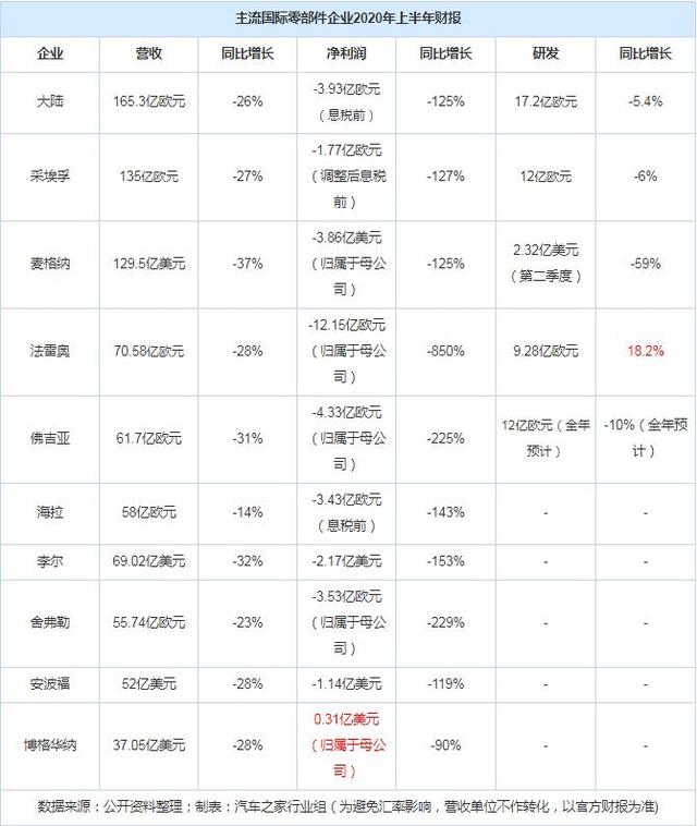 汽车之家梳理了10家主流跨国零部件企业的半年报,其营收全线下跌,平均降幅达25%以上,净利润为负的企业占9家,平均下跌超200%。