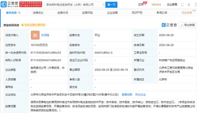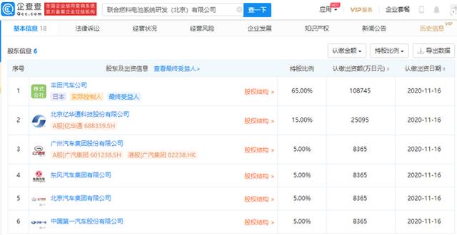 企查查APP显示,8月20日,联合燃料电池系统研发(北京)有限公司成立。该公司工商披露的股东共有6位,其中,第一大股东为丰田汽车公司,持股比例为65%,第二大股东为北京亿华通科技股份有限公司,持股比例为15%。此外,东风汽车集团有限公司、广州汽车集团股份有限公司、中国第一汽车股份有限公司、北京汽车集团有限公司并列为第三大股东,均持有5%的股份。