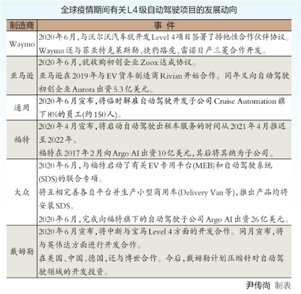 从世界汽车研究会(FOURIN)汇总的全球汽车行业最新动向来看,受新冠疫情影响,现有汽车制造商受限于研发资金紧缺,开始调整各自的研发战略,在有发展潜力的技术领域稳步扩大自身优势。戴姆勒、宝马、大众和福特均在今年5月和6月调整自动驾驶系统的研发计划,尽可能活用外部供应商和集团整体的开发资源。