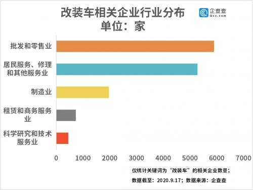从行业分布来看,改装车相关企业分布在批发和零售业的较多,达5886家,居民服务、修理和其他服务业的相关企业数量紧随其后,为5271家。制造业的改装车相关企业为1960家,居于第三位。