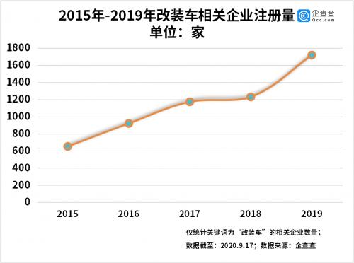 2015年以来的五年间,改装车相关企业注册量稳步增长。企查查数据显示,2015年相关企业的年注册量为653家,2019年达到1719家,同比增长39.6%。