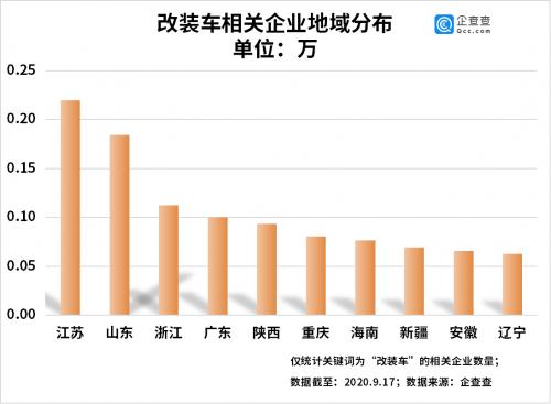 企查查数据显示,截止2020年9月,我国共有企业状态为在业/存续的改装车相关企业1.5万家。从地域分布来看,江苏省的改装车相关企业数量最多,达0.22万家。山东省和浙江省则分别以0.18万家和0.11万家居于第二和第三位。