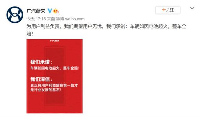 日前,广汽蔚来在其官方微博发表声明,称:该品牌旗下车型如因电池起火,将整车全赔。此前,广汽新能源埃安S曾出现过自燃、起火的事件,而该车使用了同款的宁德时代811电池。