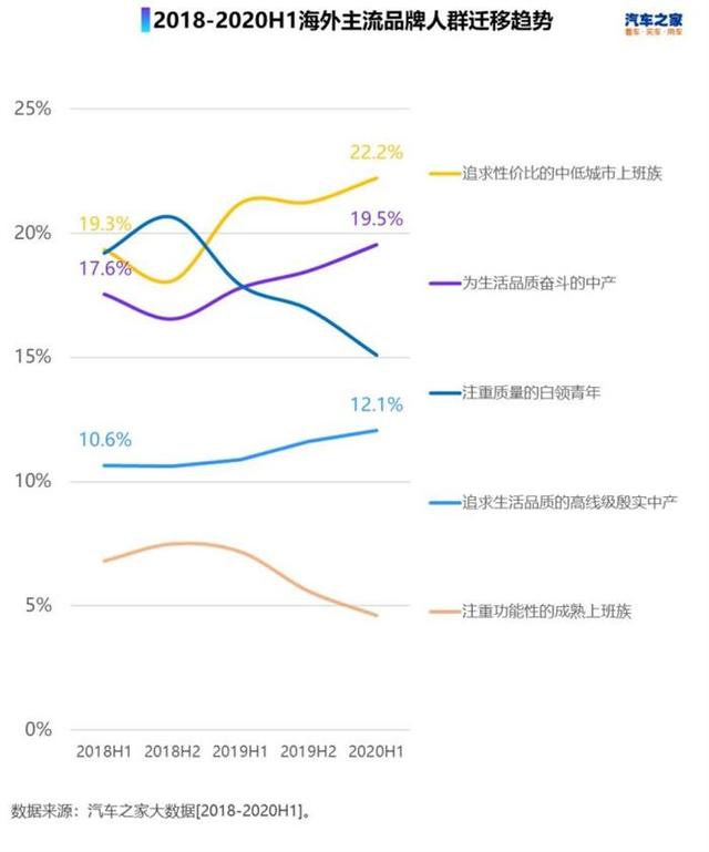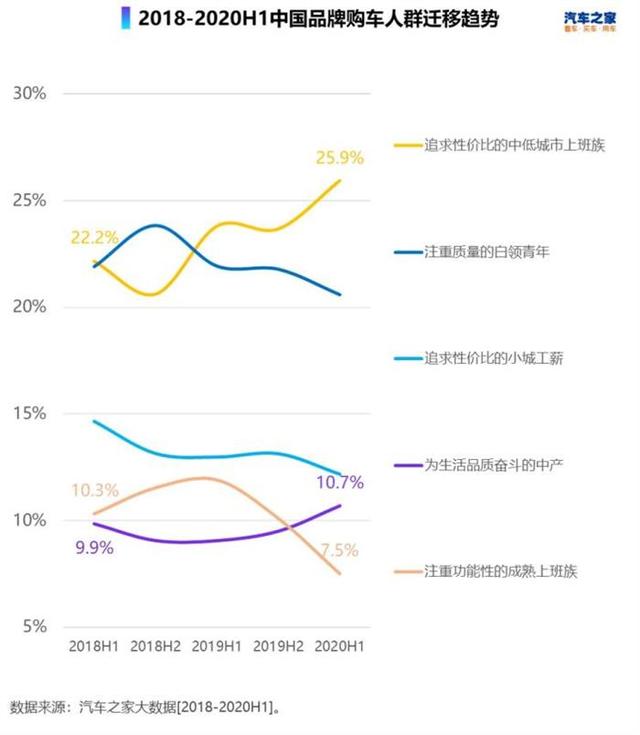 中国品牌购车人群中,“追求性价比的中低城市上班族”人群份额上升最多,2020H1较2018H1上升了3.8%。同时“为生活品质奋斗的中产”人群份额也呈现触底回升趋势。而中国品牌中“注重功能性的成熟上班族”人群占比下降最多,达到2.8%。