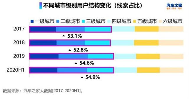三级及以上城市人群线索占比从2017年的53.1%上升至2020H1的54.9%,三级以下城市人群线索占比均有小幅下降。用户结构重心向高线城市偏移。