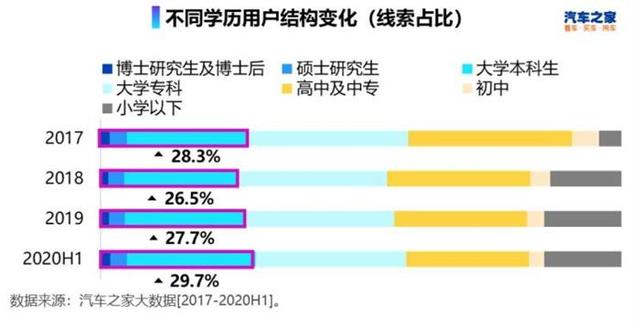 大学本科及以上学历用户线索占比略有上升,2020年上半年较2017年上升1.4%。高中及中专学历人群线索占比下降最多,2020年上半年较2017年下降7.8%。购车人群中高学历用户占比呈现微增态势。