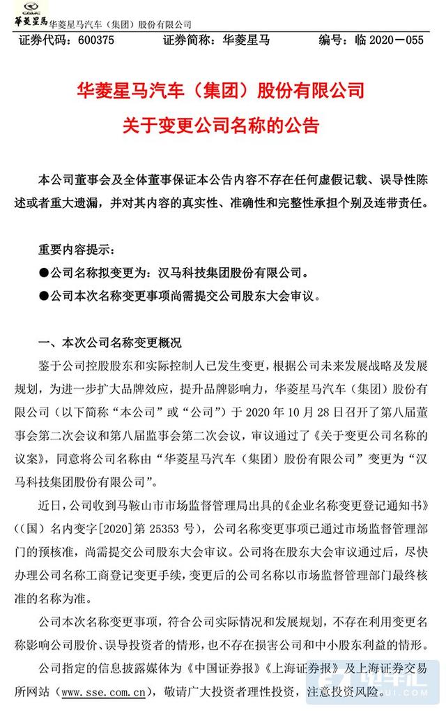 10月28日晚间,华菱星马披露,鉴于公司控股股东已变更为浙江吉利新能源商用车集团有限公司,公司实际控制人变更为李书福,根据公司未来发展战略及发展规划,为进一步扩大品牌效应,提升品牌影响力,公司拟将公司名称由“华菱星马汽车(集团)股份有限公司”变更为“汉马科技集团股份有限公司”。