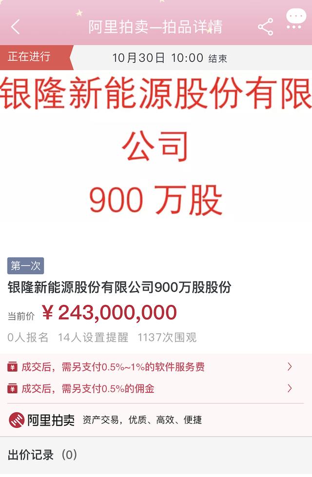 10月29日,银隆新能源的股份在阿里拍卖网进行本月最后一笔拍卖,此次被拍卖的股份总计900万股,起始价为2.43亿元。